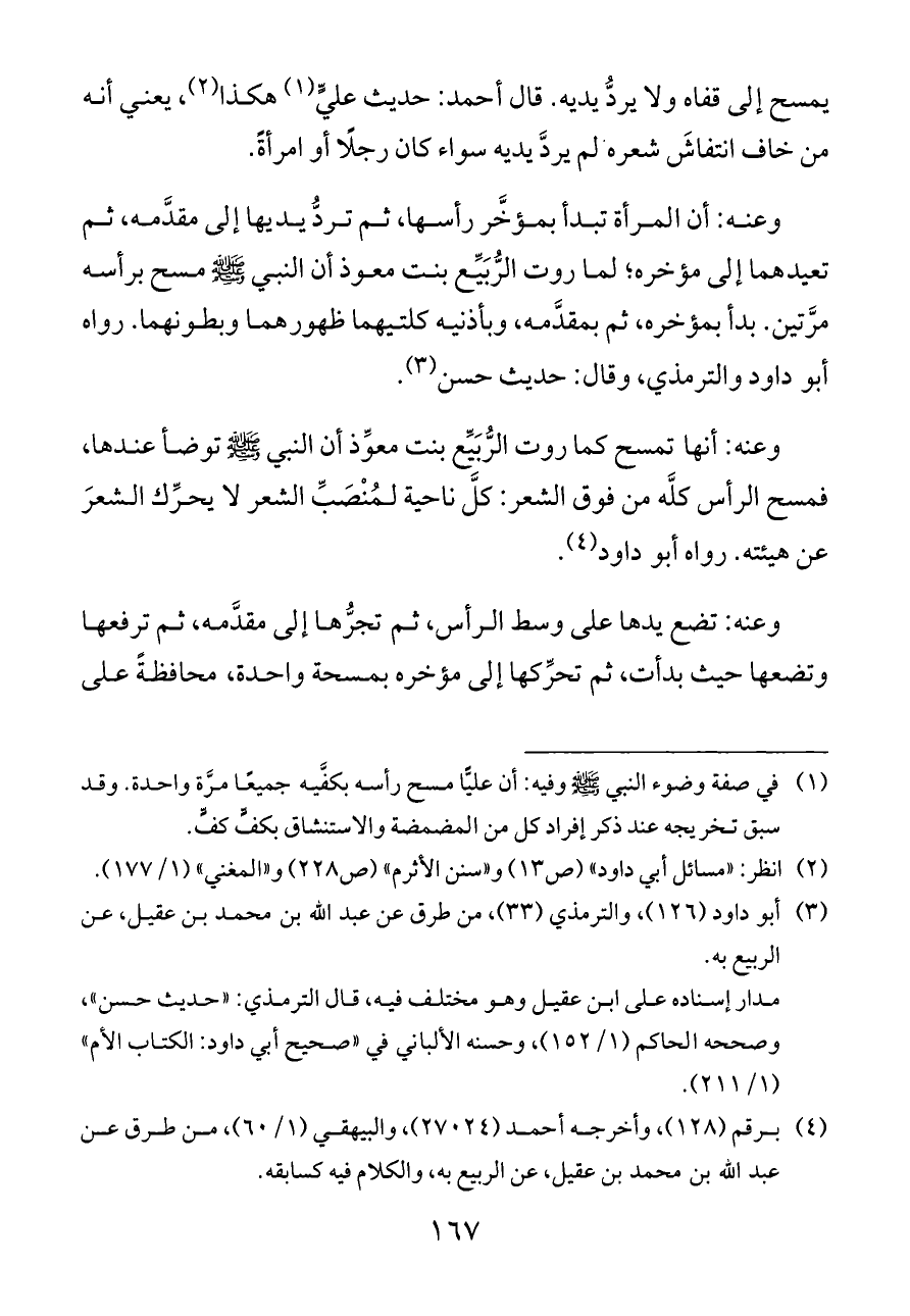 وعنه: تضع يدها على وسط الرأس، ثم تجرُّها إلى مقدَّمه، ثم ترفعها وتضعها حيث بدأت، ثم تحرِّكها إلى مؤخره بمسحة واحدة، محافظةً على