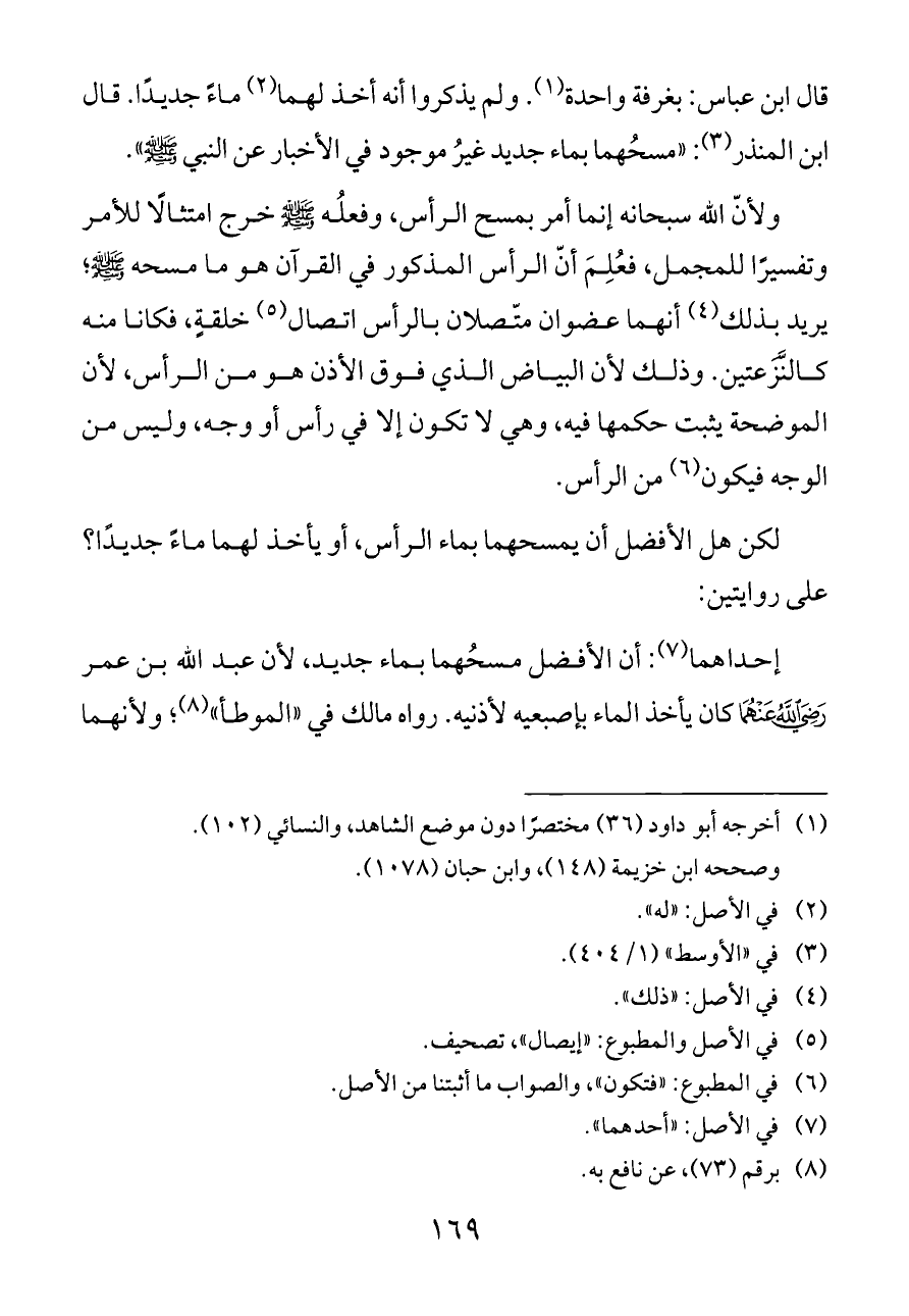 لكن هل الأفضل أن يمسحهما بماء الرأس، أو يأخذ لهما ماءً جديدًا؟ على روايتين: