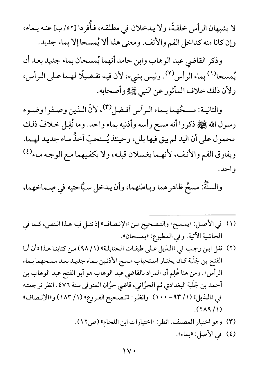 (¬٢) نقل ابن رجب في "الذيل على طبقات الحنابلة" (١/ ٩٨) من كتابنا هذا "أن أبا الفتح بن جَلَبة كان يختار استحباب مسح الأذنين بماء جديد بعد مسحهما بماء الرأس". ومن هنا عُلِم أن المراد بالقاضي عبد الوهاب هو أبو الفتح عبد الوهاب بن أحمد بن جَلَبة البغدادي ثم الحرَّاني، قاضي حرَّان المتوفى سنة ٤٧٦. انظر ترجمته في "الذيل" (١/ ٩٣ - ١٠٠). وانظر: "تصحيح الفروع" (١/ ١٨٣) و"الإنصاف" (١/ ٢٨٩).