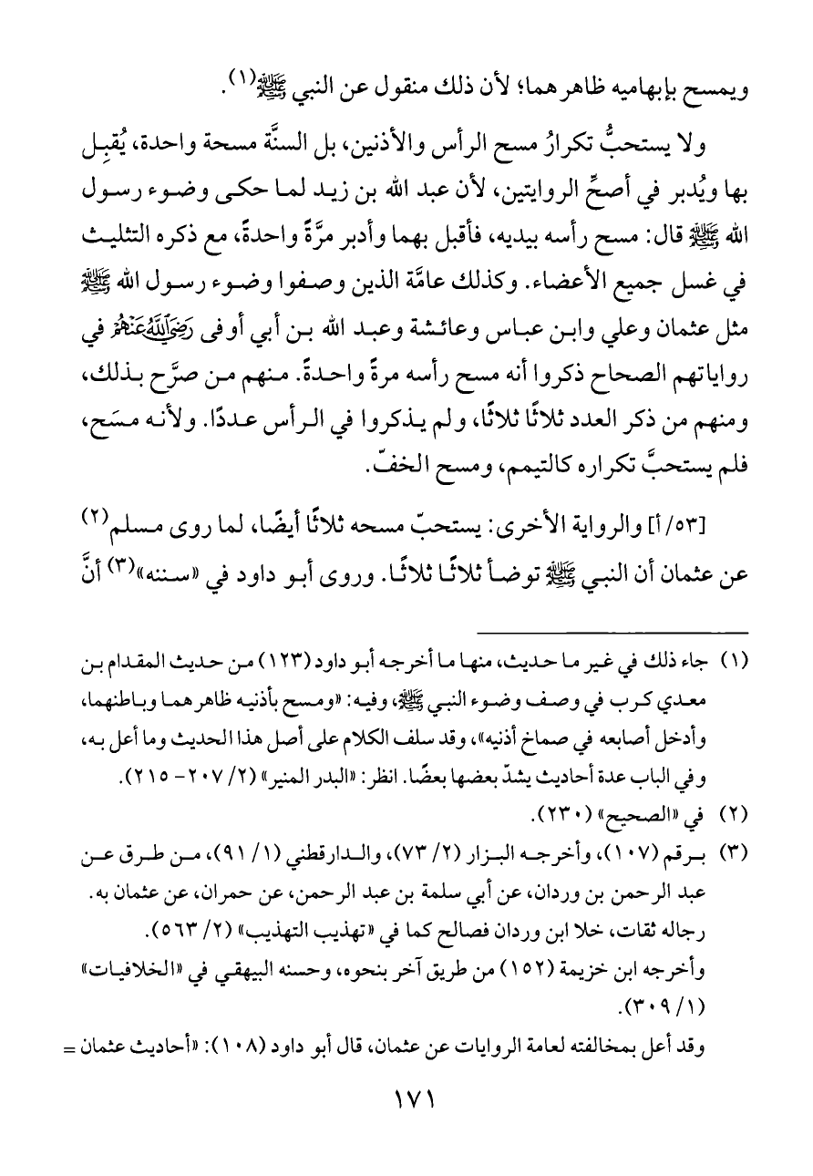 [٥٣/أ] والرواية الأخرى: يستحبّ مسحه ثلاثًا أيضًا، لما روى مسلم (¬٢) عن عثمان أن النبي - صلى الله عليه وسلم - توضأ ثلاثًا ثلاثًا. وروى أبو داود في "سننه" (¬٣) أنَّ