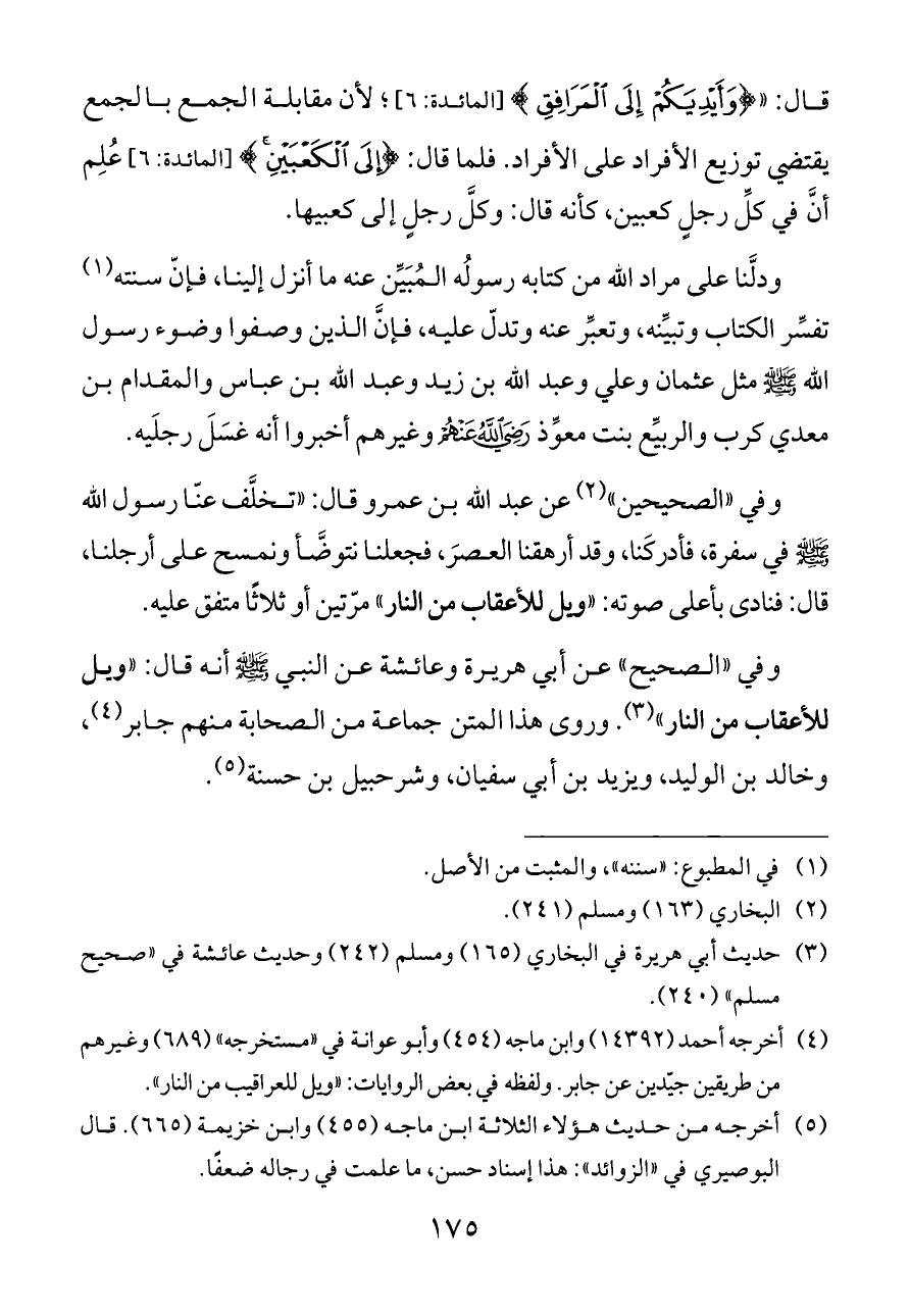 وفي "الصحيح" عن أبي هريرة وعائشة عن النبي - صلى الله عليه وسلم - أنه قال: "ويل للأعقاب من النار" (¬٣). وروى هذا المتن جماعة من الصحابة منهم جابر (¬٤)، وخالد بن الوليد، ويزيد بن أبي سفيان، وشرحبيل بن حسنة (¬٥).