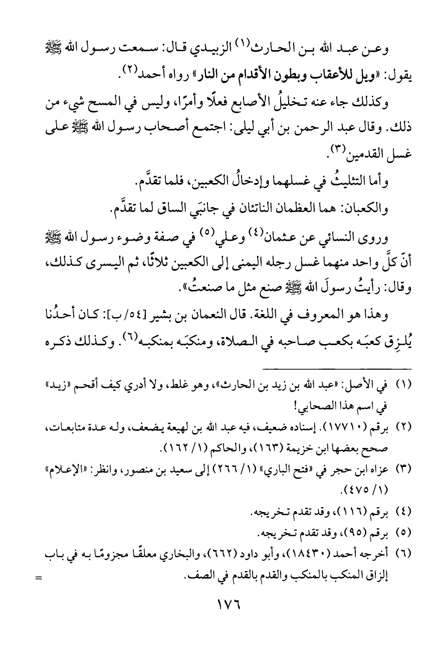 وعن عبد الله بن الحارث (¬١) الزبيدي قال: سمعت رسول الله - صلى الله عليه وسلم - يقول: "ويل للأعقاب وبطون الأقدام من النار" رواه أحمد (¬٢).
