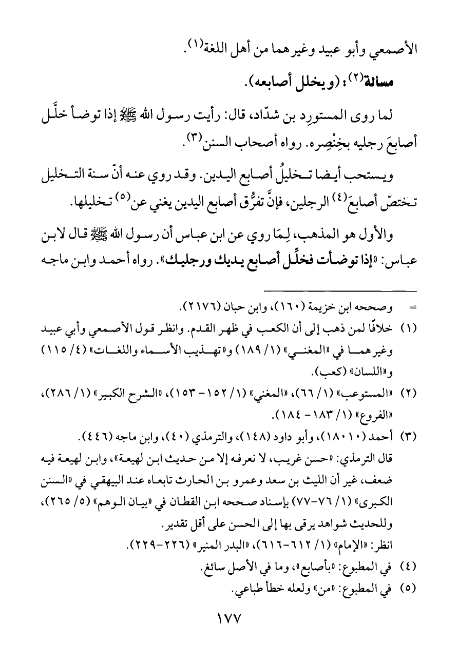 والأول هو المذهب، لِمَا روي عن ابن عباس أن رسول الله - صلى الله عليه وسلم - قال لابن عباس: "إذا توضأت فخلِّل أصابع يديك ورجليك". رواه أحمد وابن ماجه