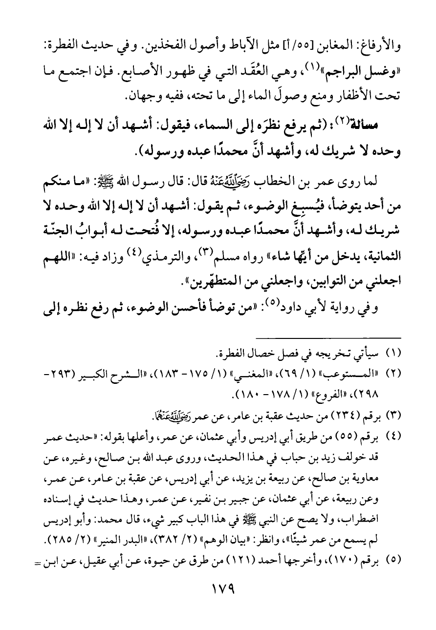 (¬٤) برقم (٥٥) من طريق أبي إدريس وأبي عثمان، عن عمر، وأعلها بقوله: "حديث عمر قد خولف زيد بن حباب في هذا الحديث، وروى عبد الله بن صالح، وغيره، عن معاوية بن صالح، عن ربيعة بن يزيد، عن أبي إدريس، عن عقبة بن عامر، عن عمر، وعن ربيعة، عن أبي عثمان، عن جبير بن نفير، عن عمر، وهذا حديث في إسناده اضطراب، ولا يصح عن النبي - صلى الله عليه وسلم - في هذا الباب كبير شيء، قال محمد: وأبو إدريس لم يسمع من عمر شيئًا"، وانظر: "بيان الوهم" (٢/ ٣٨٢)، "البدر المنير" (٢/ ٢٨٥).