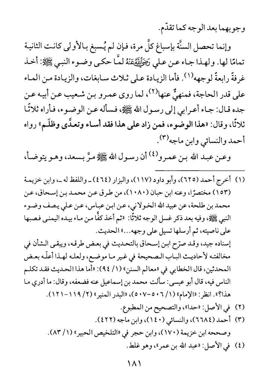 فأما الزيادة على ثلاث سابغات، والزيادة من الماء على قدر الحاجة، فمنهيٌّ عنها (¬٢)، لما روى عمرو بن شعيب عن أبيه عن جده قال: جاء أعرابي إلى رسول الله - صلى الله عليه وسلم -، فسأله عن الوضوء، فأراه ثلاثًا ثلاثًا، وقال: "هذا الوضوء، فمن زاد على هذا فقد أساء وتعدَّى وظلَم" رواه أحمد والنسائي وابن ماجه (¬٣).
