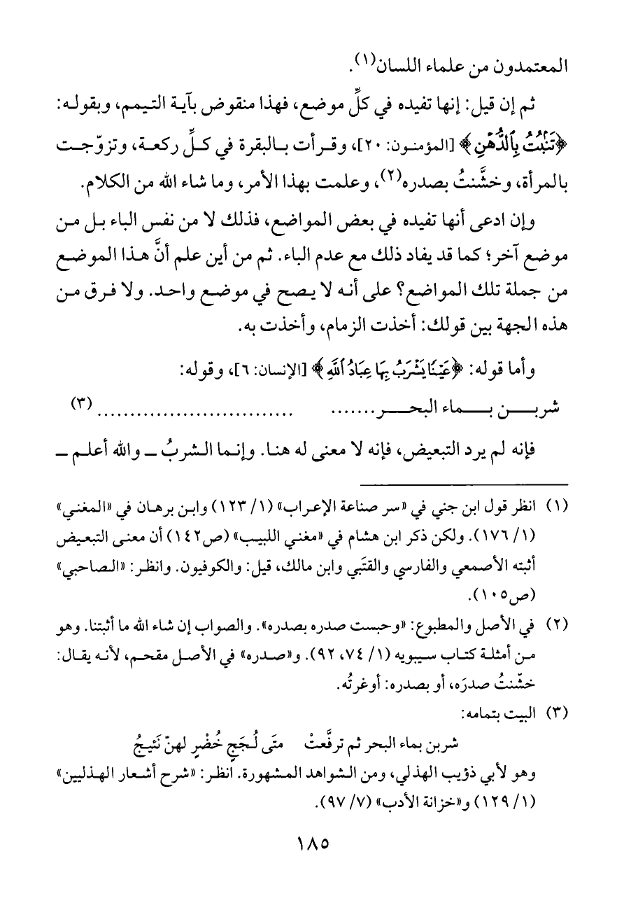 (¬١) انظر قول ابن جني في "سر صناعة الإعراب" (١/ ١٢٣) وابن برهان في "المغني" (١/ ١٧٦). ولكن ذكر ابن هشام في "مغني اللبيب" (ص ١٤٢) أن معنى التبعيض أثبته الأصمعي والفارسي والقتَبي وابن مالك، قيل: والكوفيون. وانظر: "الصاحبي" (ص ١٠٥).