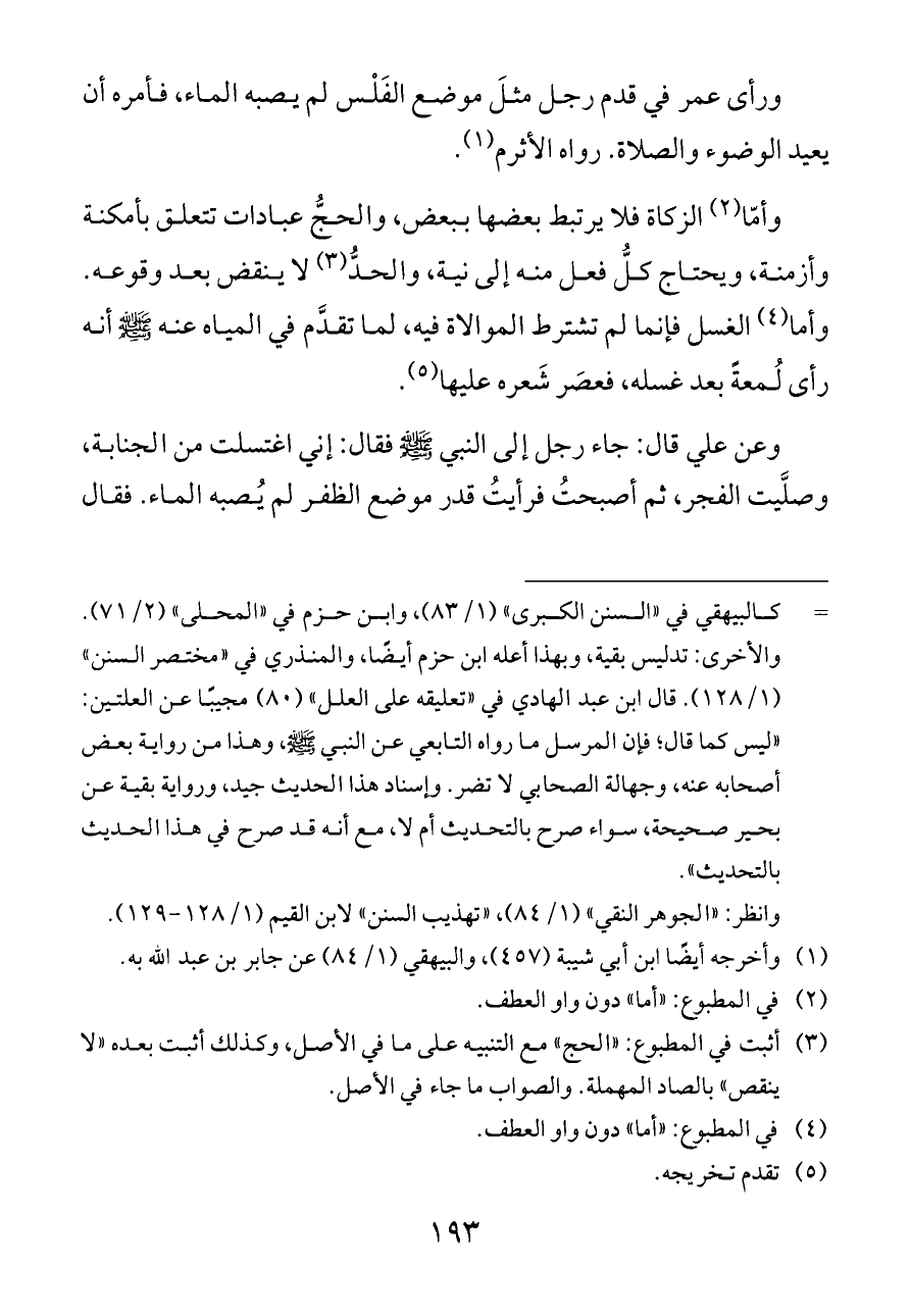 وعن علي قال: جاء رجل إلى النبي - صلى الله عليه وسلم - فقال: إني اغتسلت من الجنابة، وصلَّيت الفجر، ثم أصبحتُ فرأيتُ قدر موضع الظفر لم يُصبه الماء. فقال