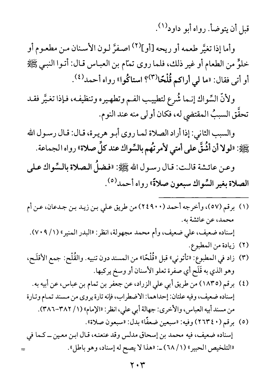وأما إذا تغيَّر طعمه أو ريحه [أو] (¬٢) اصفرَّ لون الأسنان من مطعوم أو خلوٍّ من الطعام أو غير ذلك، فلما روى تمّام بن العباس قال: أتوا النبي - صلى الله عليه وسلم - أو أتى فقال: "ما لي أراكم قُلْحًا (¬٣)؟ استاكُوا" رواه أحمد (¬٤).