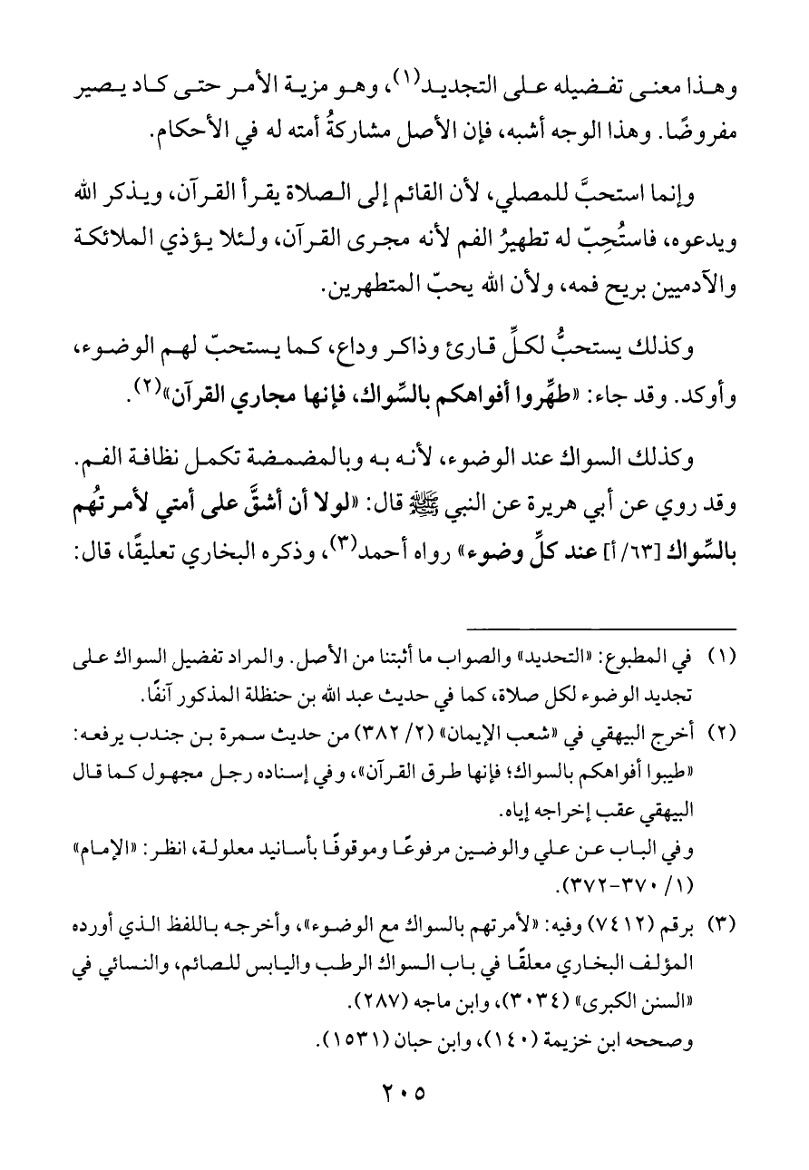 (¬١) في المطبوع: "التحديد" والصواب ما أثبتنا من الأصل. والمراد تفضيل السواك على تجديد الوضوء لكل صلاة، كما في حديث عبد الله بن حنظلة المذكور آنفًا.