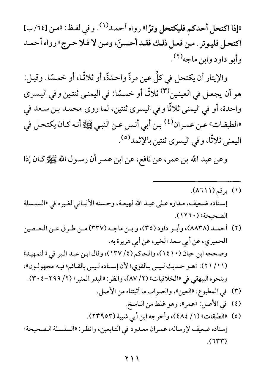 وفي لفظ: "من [٦٤/ب] اكتحل فليوتر. من فعل ذلك فقد أحسنَ، ومن لا فلا حرج" رواه أحمد وأبو داود وابن ماجه (¬٢).