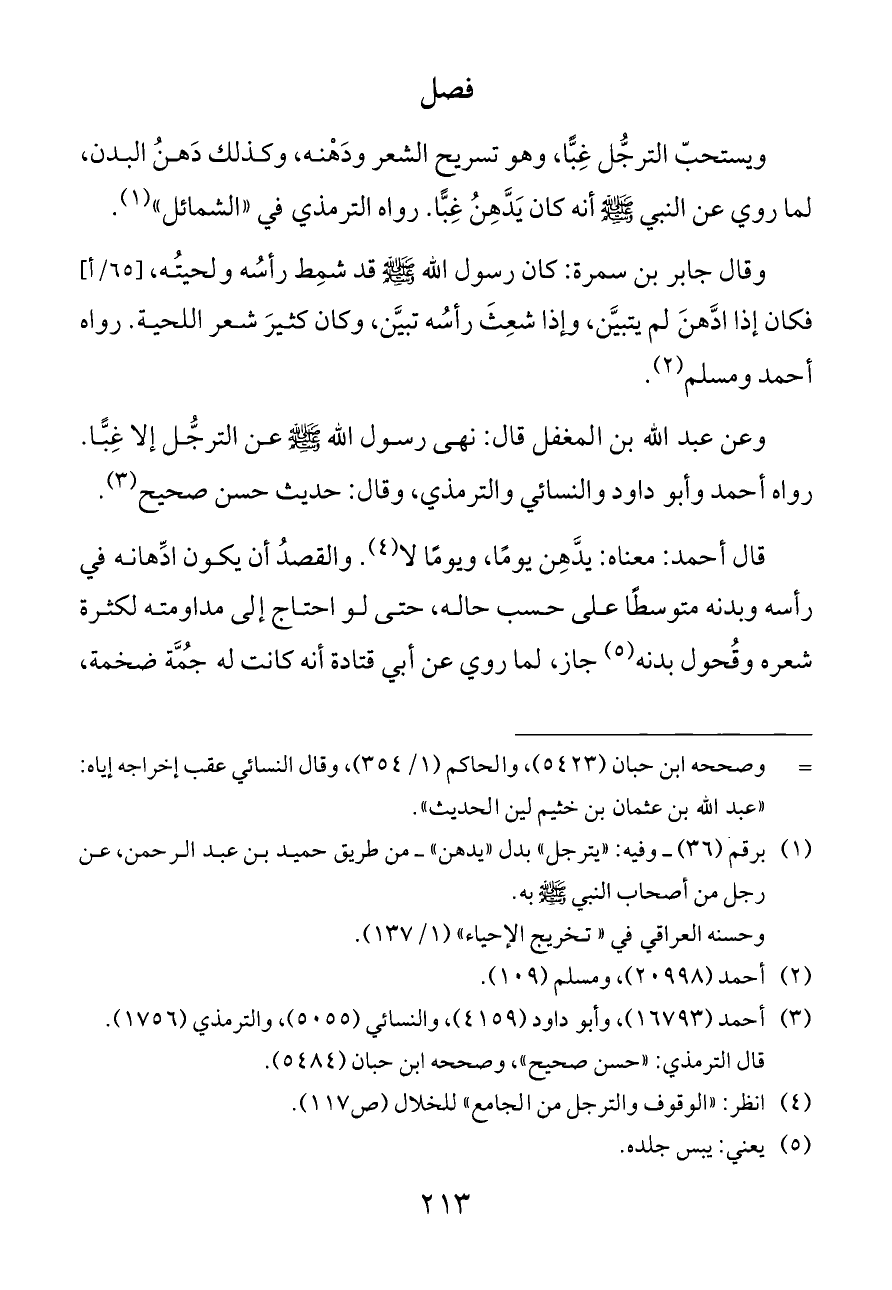 ويستحبّ الترجُّل غِبًّا، وهو تسريح الشعر ودَهْنه، وكذلك دَهنُ البدن، لما روي عن النبي - صلى الله عليه وسلم - أنه كان يَدَّهِنُ غِبًّا. رواه الترمذي في "الشمائل" (¬١).