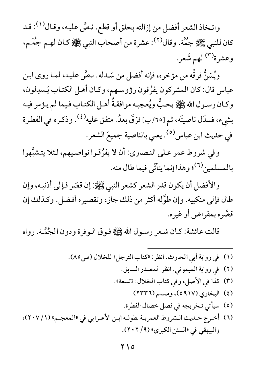 وفي شروط عمر على النصارى: أن لا يفرُقوا نواصيهم، لئلا يتشبَّهوا بالمسلمين (¬٦)؛ وهذا إنما يتأتّى فيما طال منه.