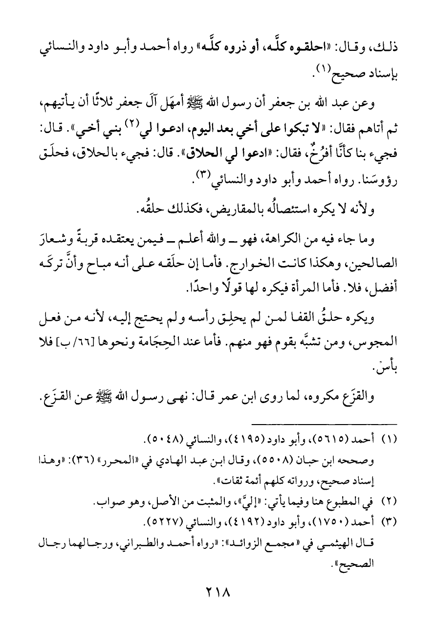 وعن عبد الله بن جعفر أن رسول الله - صلى الله عليه وسلم - أمهَل آلَ جعفر ثلاثًا أن يأتيهم، ثم أتاهم فقال: "لا تبكوا على أخي بعد اليوم، ادعوا لي (¬٢) بني أخي". قال: فجيء بنا كأنَّا أفرُخٌ، فقال: "ادعوا لي الحلاق". قال: فجيء بالحلاق، فحلَق رؤوسَنا. رواه أحمد وأبو داود والنسائي (¬٣).