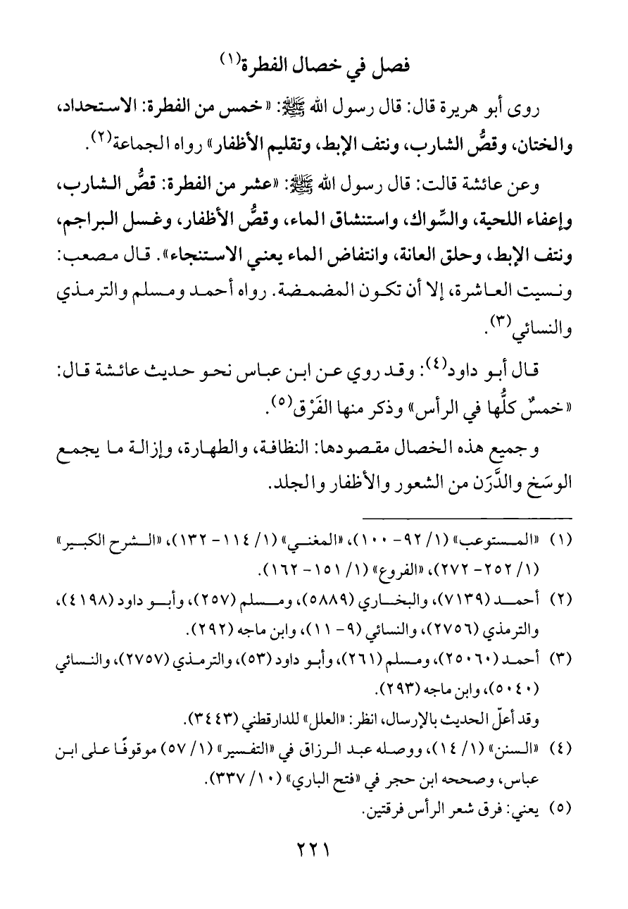 روى أبو هريرة قال: قال رسول الله - صلى الله عليه وسلم -: "خمس من الفطرة: الاستحداد، والختان، وقصُّ الشارب، ونتف الإبط، وتقليم الأظفار" رواه الجماعة (¬٢).