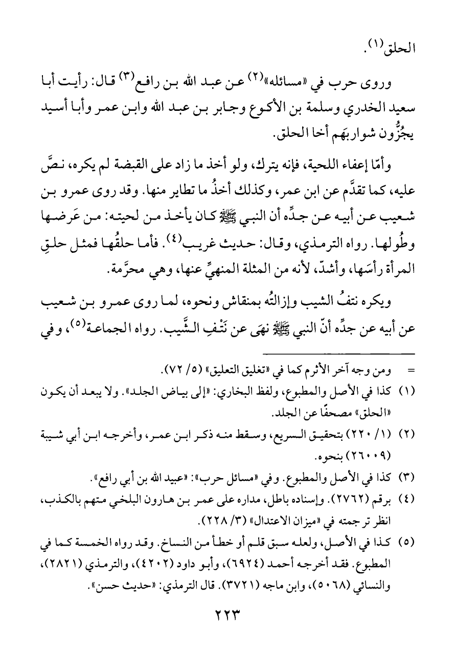 وروى حرب في "مسائله" (¬٢) عن عبد الله بن رافع (¬٣) قال: رأيت أبا سعيد الخدري وسلمة بن الأكوع وجابر بن عبد الله وابن عمر وأبا أسيد يجُزُّون شواربَهم أخا الحلق.