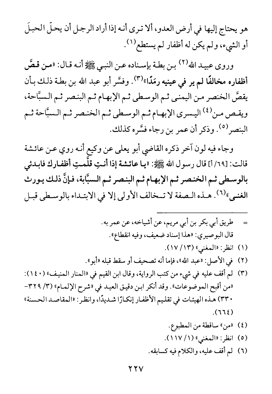 وروى عبيد الله (¬٢) بن بطة بإسناده عن النبي - صلى الله عليه وسلم - أنه قال: "من قصَّ أظفاره مخالفًا لم ير في عينيه رمَدًا" (¬٣). وفسَّر أبو عبد الله بن بطة ذلك بأن يقصَّ الخنصر من اليمنى ثم الوسطى ثم الإبهام ثم البنصر ثم السبَّاحة، ويقص من (¬٤) اليسرى الإبهام ثم الوسطى ثم الخنصر ثم السبَّاحة ثم البنصر (¬٥). وذكر أن عمر بن رجاء فسَّره كذلك.
