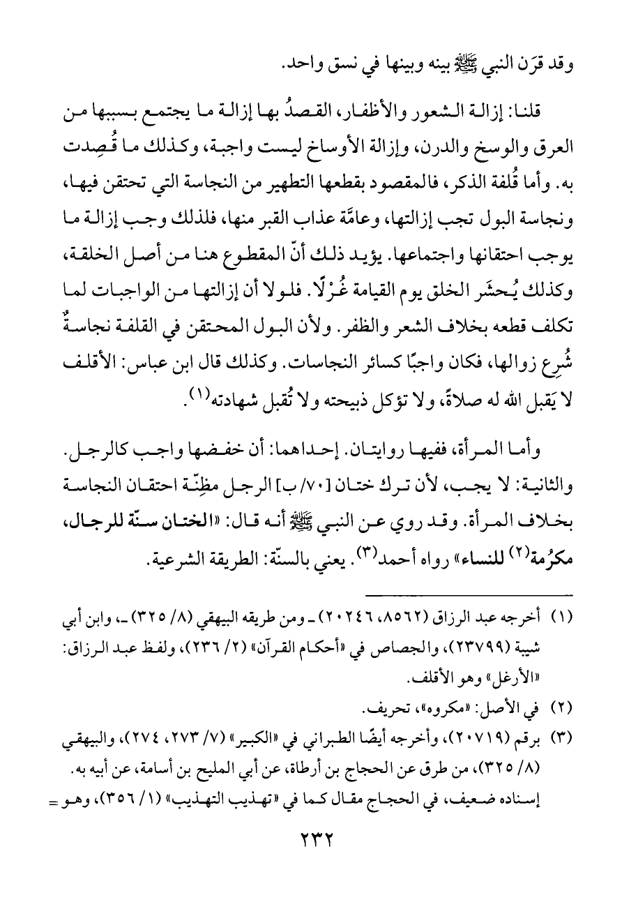 قلنا: إزالة الشعور والأظفار، القصدُ بها إزالة ما يجتمع بسببها من العرق والوسخ والدرن، وإزالة الأوساخ ليست واجبة، وكذلك ما قُصِدت به. وأما قُلفة الذكر، فالمقصود بقطعها التطهير من النجاسة التي تحتقن فيها، ونجاسة البول تجب إزالتها، وعامَّة عذاب القبر منها، فلذلك وجب إزالة ما يوجب احتقانها واجتماعها. يؤيد ذلك أنّ المقطوع هنا من أصل الخلقة، وكذلك يُحشَر الخلق يوم القيامة غُرْلًا. فلولا أن إزالتها من الواجبات لما تكلف قطعه بخلاف الشعر والظفر. ولأن البول المحتقن في القلفة نجاسةٌ شُرِع زوالها، فكان واجبًا كسائر النجاسات. وكذلك قال ابن عباس: الأقلف لا يَقبل الله له صلاةً، ولا تؤكل ذبيحته ولا تُقبل شهادته (¬١).