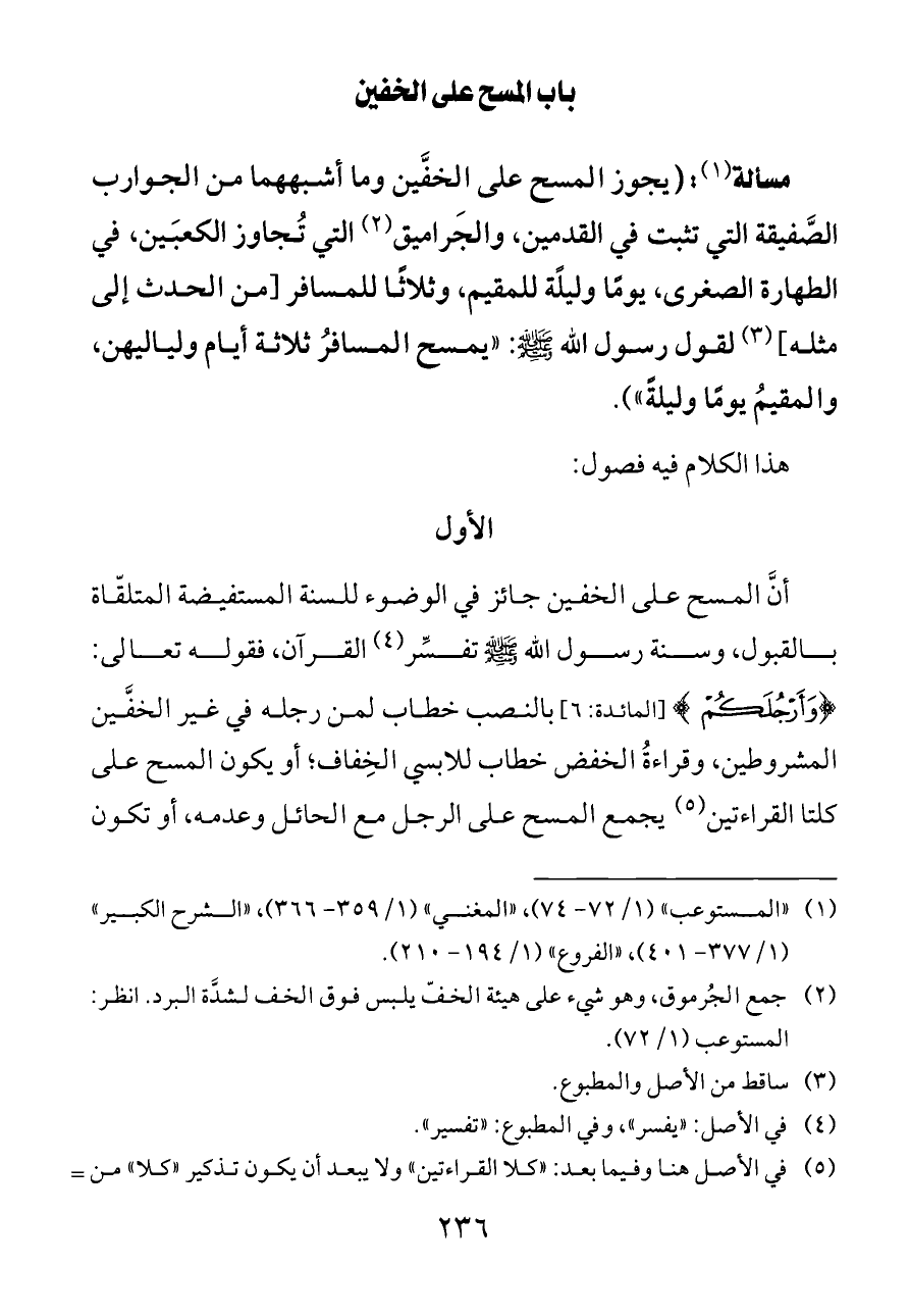 أنَّ المسح على الخفين جائز في الوضوء للسنة المستفيضة المتلقّاة بالقبول، وسنة رسول الله - صلى الله عليه وسلم - تفسِّر (¬٤) القرآن، فقوله تعالى: {وَأَرْجُلَكُمْ} [المائدة: ٦] بالنصب خطاب لمن رجله في غير الخفَّين المشروطين، وقراءةُ الخفض خطاب للابسي الخِفاف؛ أو يكون المسح على كلتا القراءتين (¬٥) يجمع المسح على الرجل مع الحائل وعدمه، أو تكون