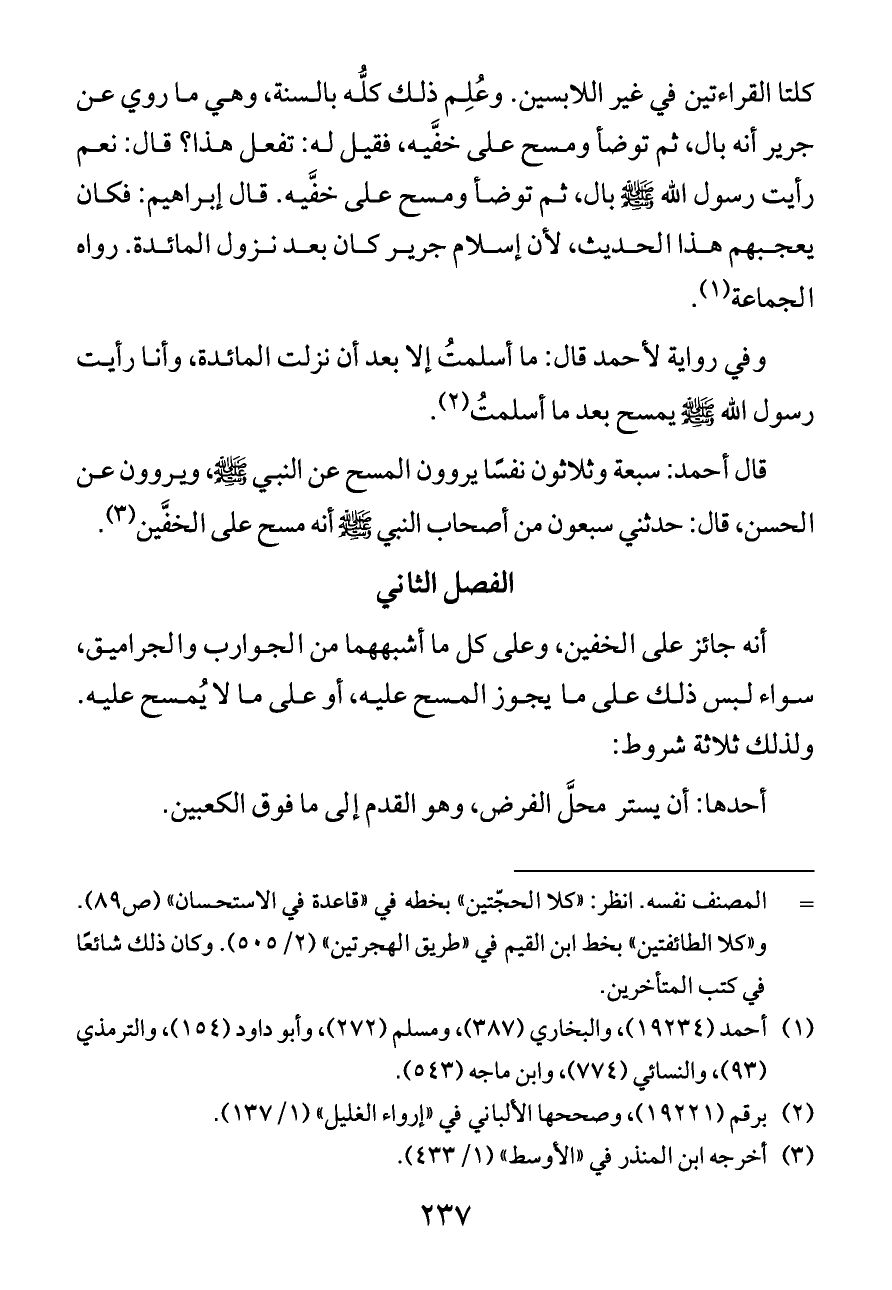 كلتا القراءتين في غير اللابسين. وعُلِم ذلك كلُّه بالسنة، وهي ما روي عن جرير أنه بال، ثم توضأ ومسح على خفَّيه، فقيل له: تفعل هذا؟ قال: نعم رأيت رسول الله - صلى الله عليه وسلم - بال، ثم توضأ ومسح على خفَّيه. قال إبراهيم: فكان يعجبهم هذا الحديث، لأن إسلام جرير كان بعد نزول المائدة. رواه الجماعة (¬١).
