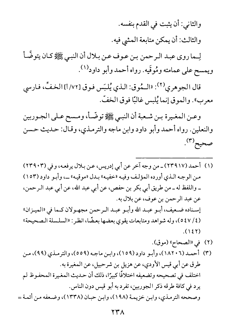 وعن المغيرة بن شعبة أن النبي - صلى الله عليه وسلم - توضّأ، ومسح على الجوربين والنعلين. رواه أحمد وأبو داود وابن ماجه والترمذي، وقال: حديث حسن صحيح (¬٣).