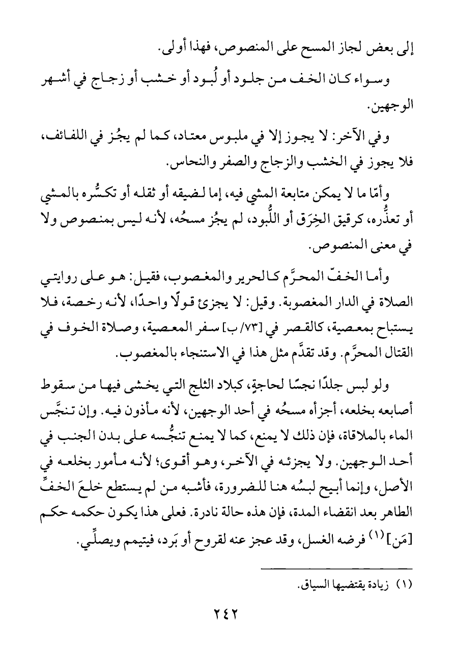 وأما الخفّ المحرَّم كالحرير والمغصوب، فقيل: هو على روايتي الصلاة في الدار المغصوبة. وقيل: لا يجزئ قولًا واحدًا، لأنه رخصة، فلا يستباح بمعصية، كالقصر في [٧٣/ب] سفر المعصية، وصلاة الخوف في القتال المحرَّم. وقد تقدَّم مثل هذا في الاستنجاء بالمغصوب.