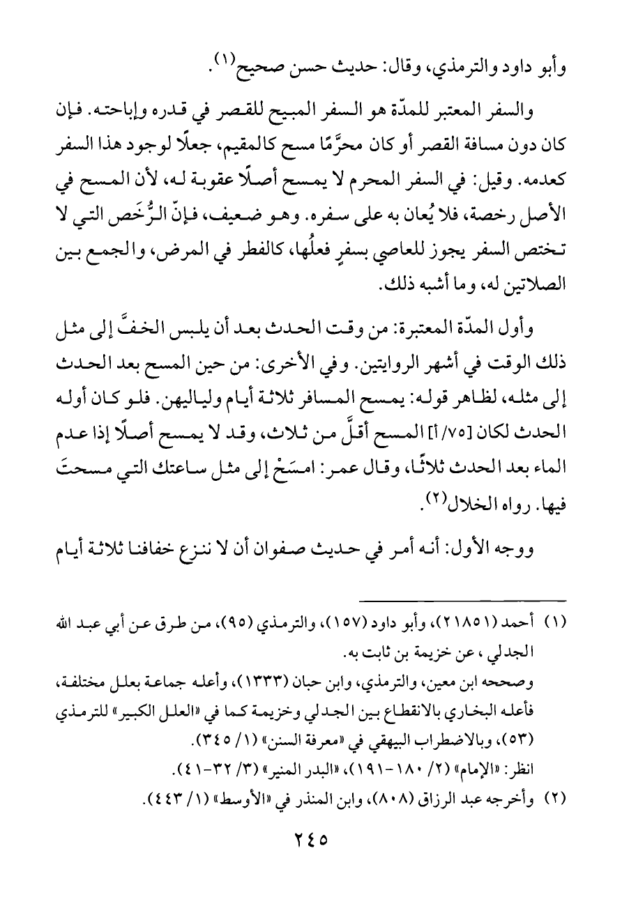 وأول المدّة المعتبرة: من وقت الحدث بعد أن يلبس الخفَّ إلى مثل ذلك الوقت في أشهر الروايتين. وفي الأخرى: من حين المسح بعد الحدث إلى مثله، لظاهر قوله: يمسح المسافر ثلاثة أيام ولياليهن. فلو كان أوله الحدث لكان [٧٥/أ] المسح أقلَّ من ثلاث، وقد لا يمسح أصلًا إذا عدم الماء بعد الحدث ثلاثًا، وقال عمر: امسَحْ إلى مثل ساعتك التي مسحتَ فيها. رواه الخلال (¬٢).