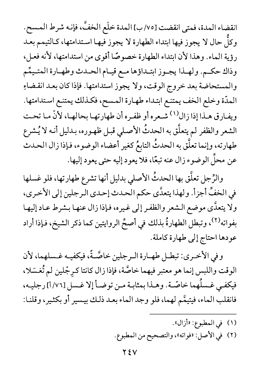 انقضاء المدة، فمتى انقضت [٧٥/ب] المدة خلَع الخفَّ، فإنه شرط المسح. وكلُّ حال لا يجوز فيها ابتداء الطهارة لا يجوز فيها استدامتها، كالتيمم بعد رؤية الماء. وهذا لأن ابتداء الطهارة خصوصًا أقوى من استدامتها، لأنه فعل، وذاك حكم. ولهذا يجوز ابتداؤها مع قيام الحدث وطهارة المتيمِّم والمستحاضة بعد خروج الوقت، ولا يجوز استدامتها. فإذا كان بعد انقضاءِ المدّة وخلع الخف يمتنع ابتداء طهارة المسح، فكذلك يمتنع استدامتها. ويفارق هذا إذا زال (¬١) شعره أو ظفره أن طهارتها بحالها، لأنّ ما تحت الشعر والظفر لم يتعلَّق به الحدثُ الأصلي قبل ظهوره، بدليل أنه لا يُشرع طهارته، وإنما تعلَّق به الحدثُ التابعُ كغير أعضاء الوضوء، فإذا زال الحدث عن محلِّ الوضوء زال عنه تبعًا، فلا يعود إليه حتى يعود إليها.