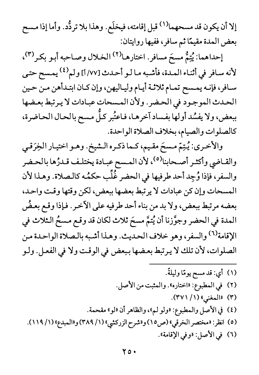 والأخرى: يُتِمّ مسحَ مقيم، كما ذكره الشيخ. وهو اختيار الخِرَقي والقاضي وأكثر أصحابنا (¬٥)، لأن المسح عبادة يختلف قدرُها بالحضر والسفر، فإذا وُجِد أحد طرفيها في الحضر غُلِّب حكمُه كالصلاة. وهذا لأن المسحات وإن كن عبادات لا يرتبط بعضها ببعض، لكن وقتها وقت واحد، بعضه مرتبط ببعض، ولا بد من بناء أحد طرفيه على الآخر. فإذا وقع بعضُ المدة في الحضر وجوَّزنا أن يُتمَّ مسحَ ثلاث لكان قد وقع مسحُ الثلاث في الإقامة (¬٦) والسفر، وهو خلاف الحديث. وهذا أشبه بالصلاة الواحدة من الصلوات، لأن تلك لا يرتبط بعضها ببعض في الوقت ولا في الفعل. ولو