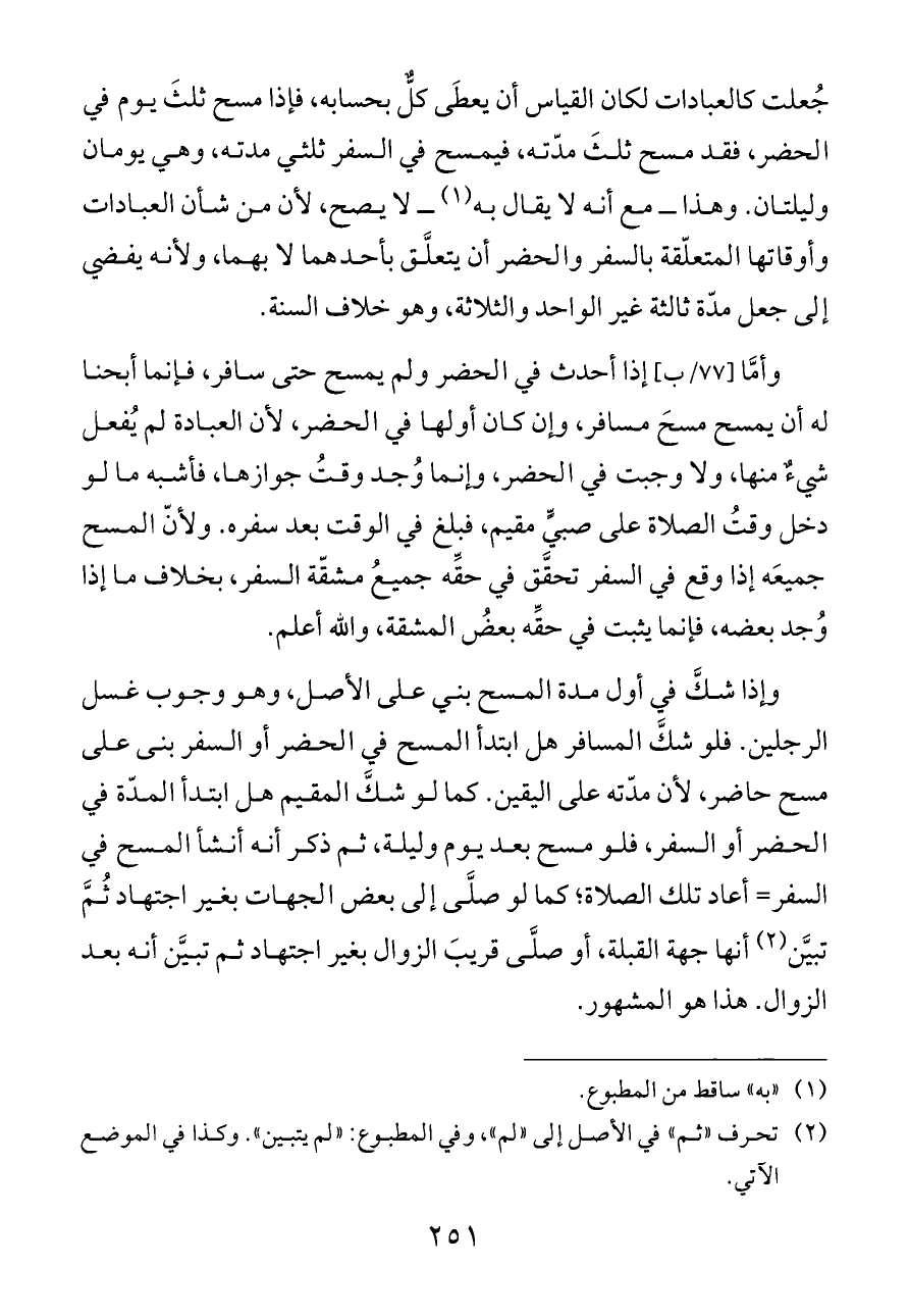 وإذا شكَّ في أول مدة المسح بني على الأصل، وهو وجوب غسل الرجلين. فلو شكَّ المسافر هل ابتدأ المسح في الحضر أو السفر بنى على مسح حاضر، لأن مدّته على اليقين. كما لو شكَّ المقيم هل ابتدأ المدّة في الحضر أو السفر، فلو مسح بعد يوم وليلة، ثم ذكر أنه أنشأ المسح في السفر= أعاد تلك الصلاة؛ كما لو صلَّى إلى بعض الجهات بغير اجتهاد ثُمَّ تبيَّن (¬٢) أنها جهة القبلة، أو صلَّى قريبَ الزوال بغير اجتهاد ثم تبيَّن أنه بعد الزوال. هذا هو المشهور.