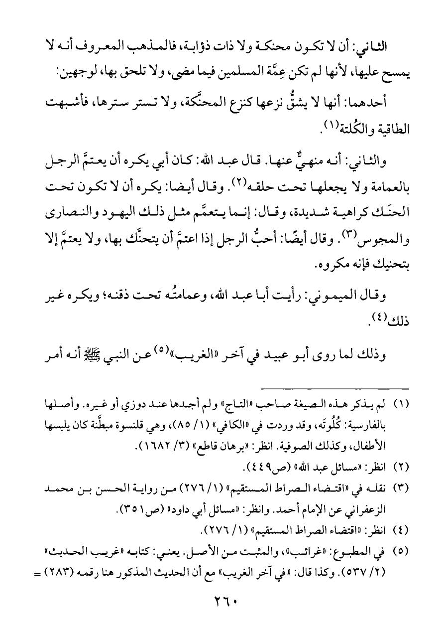 والثاني: أنه منهيٌّ عنها. قال عبد الله: كان أبي يكره أن يعتمَّ الرجل بالعمامة ولا يجعلها تحت حلقه (¬٢). وقال أيضا: يكره أن لا تكون تحت الحنَك كراهية شديدة، وقال: إنما يتعمَّم مثل ذلك اليهود والنصارى والمجوس (¬٣). وقال أيضًا: أحبُّ الرجل إذا اعتمَّ أن يتحنَّك بها، ولا يعتمَّ إلا بتحنيك فإنه مكروه.