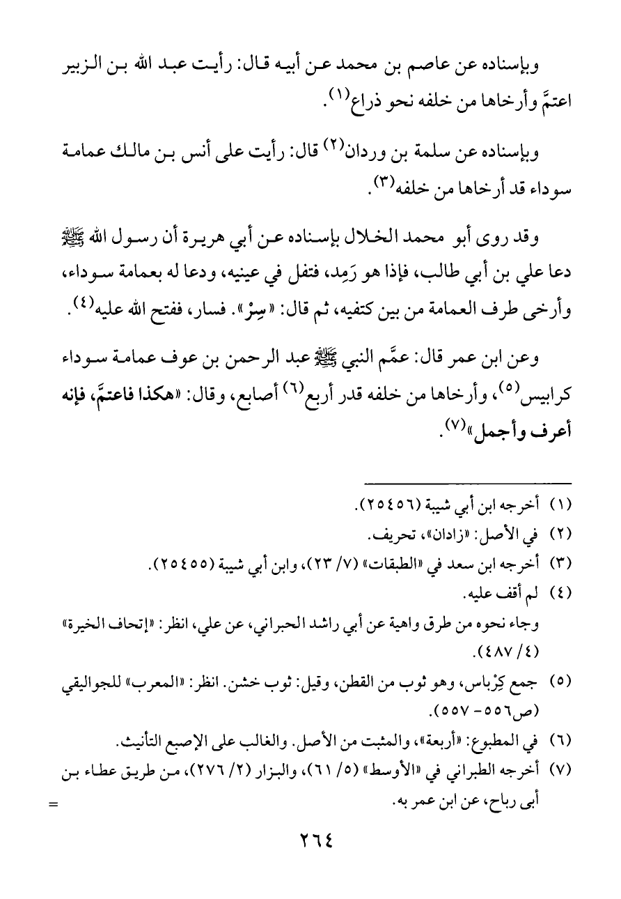 وبإسناده عن عاصم بن محمد عن أبيه قال: رأيت عبد الله بن الزبير اعتمَّ وأرخاها من خلفه نحو ذراع (¬١).