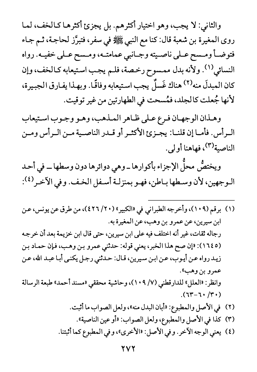 والثاني: لا يجب، وهو اختيار أكثرهم. بل يجزئ أكثرها كالخف، لما روى المغيرة بن شعبة قال: كنا مع النبي - صلى الله عليه وسلم - في سفر، فتبرَّز لحاجة، ثم جاء فتوضأ ومسح على ناصيته وجانبي عمامته، ومسح على خفيه. رواه النسائي (¬١).