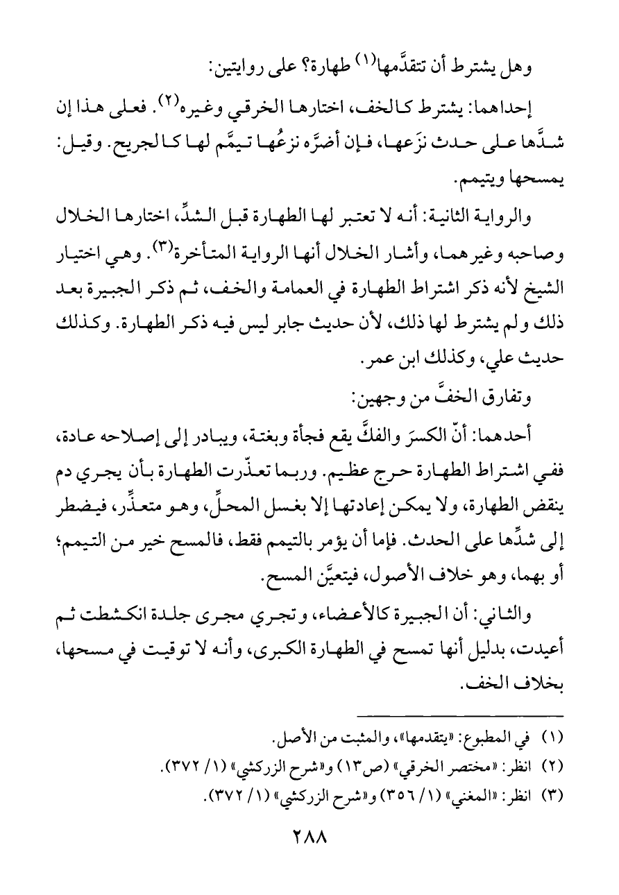 والرواية الثانية: أنه لا تعتبر لها الطهارة قبل الشدِّ، اختارها الخلال وصاحبه وغيرهما، وأشار الخلال أنها الرواية المتأخرة (¬٣). وهي اختيار الشيخ لأنه ذكر اشتراط الطهارة في العمامة والخف، ثم ذكر الجبيرة بعد ذلك ولم يشترط لها ذلك، لأن حديث جابر ليس فيه ذكر الطهارة. وكذلك حديث علي، وكذلك ابن عمر.