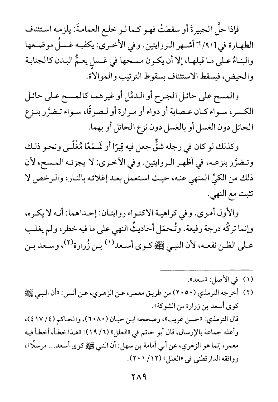 وكذلك لو كان في رجله شقٌّ جعل فيه قِيرًا أو شَمْعًا مُغْلًى ونحو ذلك وتضرَّر بنزعه، في أظهر الروايتين. وفي الأخرى: لا يجزئه المسح، لأن ذلك من الكيِّ المنهي عنه، حيث استعمل بعد إغلائه بالنار، والرخص لا تثبت مع النهي.