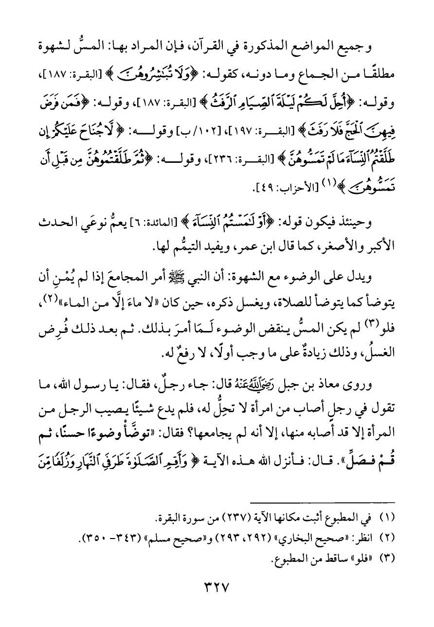 وجميع المواضع المذكورة في القرآن، فإن المراد بها: المسُّ لشهوة مطلقًا من الجماع وما دونه، كقوله: {وَلَا تُبَاشِرُوهُنَّ} [البقرة: ١٨٧]، وقوله: {أُحِلَّ لَكُمْ لَيْلَةَ الصِّيَامِ الرَّفَثُ} [البقرة: ١٨٧]، وقوله: {فَمَنْ فَرَضَ فِيهِنَّ الْحَجَّ فَلَا رَفَثَ} [البقرة: ١٩٧]، [١٠٢/ب] وقوله: {لَا جُنَاحَ عَلَيْكُمْ إِنْ طَلَّقْتُمُ النِّسَاءَ مَا لَمْ تَمَسُّوهُنَّ} [البقرة: ٢٣٦]، وقوله: {ثُمَّ طَلَّقْتُمُوهُنَّ مِنْ قَبْلِ أَنْ تَمَسُّوهُنَّ} (¬١) [الأحزاب: ٤٩].