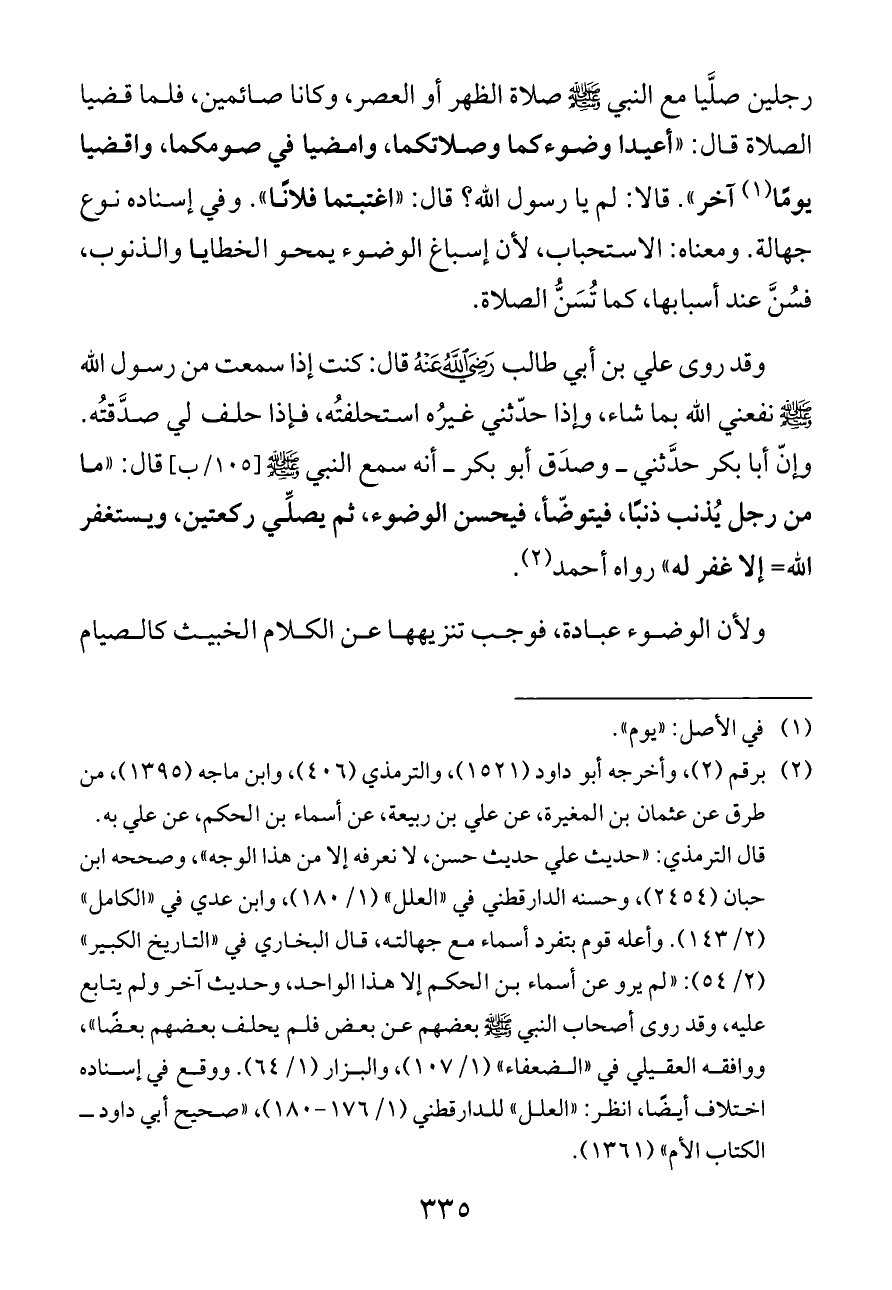 رجلين صلَّيا مع النبي - صلى الله عليه وسلم - صلاة الظهر أو العصر، وكانا صائمين، فلما قضيا الصلاة قال: «أعيدا وضوءكما وصلاتكما، وامضيا في صومكما، واقضيا يومًا (¬١) آخر». قالا: لم يا رسول الله؟ قال: «اغتبتما فلانًا». وفي إسناده نوع جهالة. ومعناه: الاستحباب، لأن إسباغ الوضوء يمحو الخطايا والذنوب، فسُنَّ عند أسبابها، كما تُسَنُّ الصلاة.