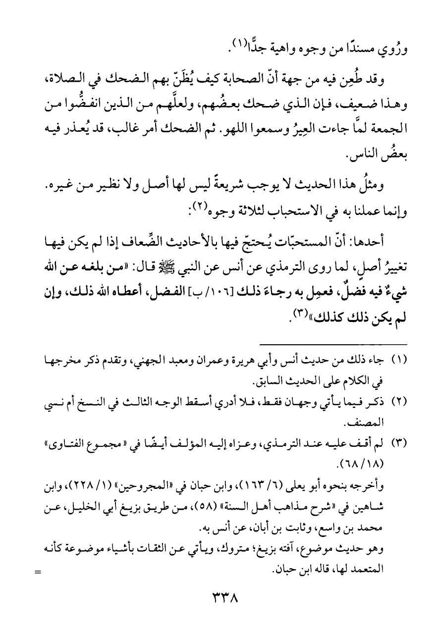 أحدها: أنّ المستحبّات يُحتجّ فيها بالأحاديث الضِّعاف إذا لم يكن فيها تغييرُ أصلٍ، لما روى الترمذي عن أنس عن النبي - صلى الله عليه وسلم - قال: «من بلغه عن الله شيءٌ فيه فضلٌ، فعمِل به رجاءَ ذلك [١٠٦/ب] الفضل، أعطاه الله ذلك، وإن لم يكن ذلك كذلك» (¬٣).