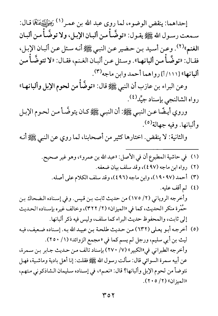 إحداهما: ينقض الوضوء، لما روى عبد الله بن عمر (¬١) - رضي الله عنهما - قال: سمعت رسول الله - صلى الله عليه وسلم - يقول: «توضَّأْ من ألبان الإبل، ولا توضَّأْ من ألبان الغنم» (¬٢). وعن أسيد بن حضير عن النبي - صلى الله عليه وسلم - أنه سئل عن ألبان الإبل، فقال: «توضَّأْ من ألبانها». وسئل عن ألبان الغنم، فقال: «لا تتوضَّأْ من ألبانها» [١١١/أ] رواهما أحمد وابن ماجه (¬٣).