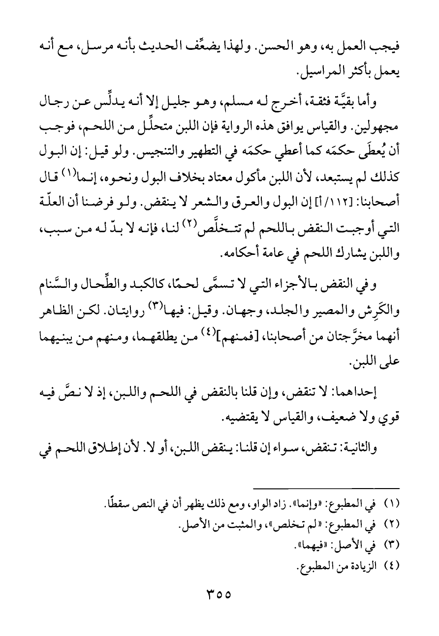 وأما بقيَّة فثقة، أخرج له مسلم، وهو جليل إلا أنه يدلِّس عن رجال مجهولين. والقياس يوافق هذه الرواية فإن اللبن متحلِّل من اللحم، فوجب أن يُعطَى حكمَه كما أعطي حكمَه في التطهير والتنجيس. ولو قيل: إن البول كذلك لم يستبعد، لأن اللبن مأكول معتاد بخلاف البول ونحوه، إنما (¬١) قال أصحابنا: [١١٢/أ] إن البول والعرق والشعر لا ينقض. ولو فرضنا أن العلّة التي أوجبت النقض باللحم لم تتخلَّص (¬٢) لنا، فإنه لا بدّ له من سبب، واللبن يشارك اللحم في عامة أحكامه.