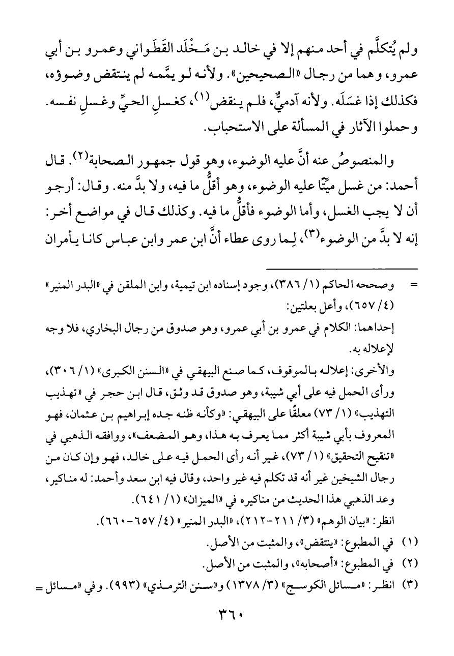 (¬٣) انظر: «مسائل الكوسج» (٣/ ١٣٧٨) و «سنن الترمذي» (٩٩٣). وفي «مسائل صالح» (١/ ٣٤٢): «أكثر ما فيه الوضوء». وانظر: «مسائل ابن هاني» (١/ ١٨٤).