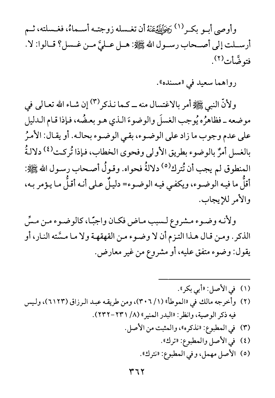 ولأنّ النبي - صلى الله عليه وسلم - أمر بالاغتسال منه ــ كما نذكر (¬٣) إن شاء الله تعالى في موضعه ــ فظاهرُه يُوجب الغسلَ والوضوءَ الذي هو بعضُه، فإذا قام الدليل على عدم وجوب ما زاد على الوضوء، بقي الوضوء بحاله. أو يقال: الأمرُ بالغسل أمرٌ بالوضوء بطريق الأولى وفحوى الخطاب، فإذا تُركت (¬٤) دلالةُ المنطوق لم يجب أن تُترك (¬٥) دلالةُ فحواه. وقولُ أصحاب رسول الله - صلى الله عليه وسلم -: أقلُّ ما فيه الوضوء، ويكفي فيه الوضوء= دليلٌ على أنه أقلُّ ما يؤمر به، والأمر للإيجاب.