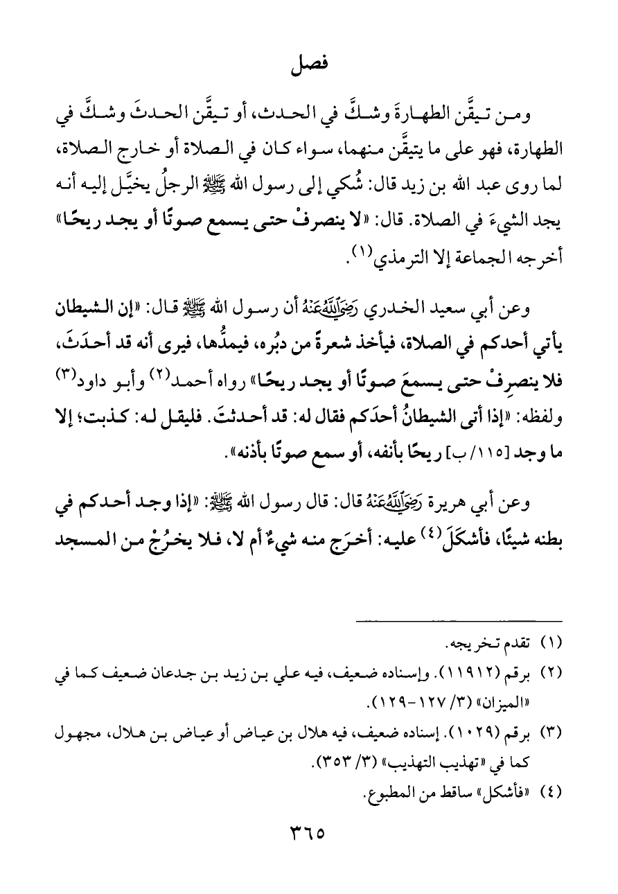 وعن أبي سعيد الخدري - رضي الله عنه - أن رسول الله - صلى الله عليه وسلم - قال: «إن الشيطان يأتي أحدكم في الصلاة، فيأخذ شعرةً من دبُره، فيمدُّها، فيرى أنه قد أحدَثَ، فلا ينصرِفْ حتى يسمعَ صوتًا أو يجد ريحًا» رواه أحمد (¬٢) وأبو داود (¬٣) ولفظه: «إذا أتى الشيطانُ أحدَكم فقال له: قد أحدثتَ. فليقل له: كذبت؛ إلا ما وجد [١١٥/ب] ريحًا بأنفه، أو سمع صوتًا بأذنه».