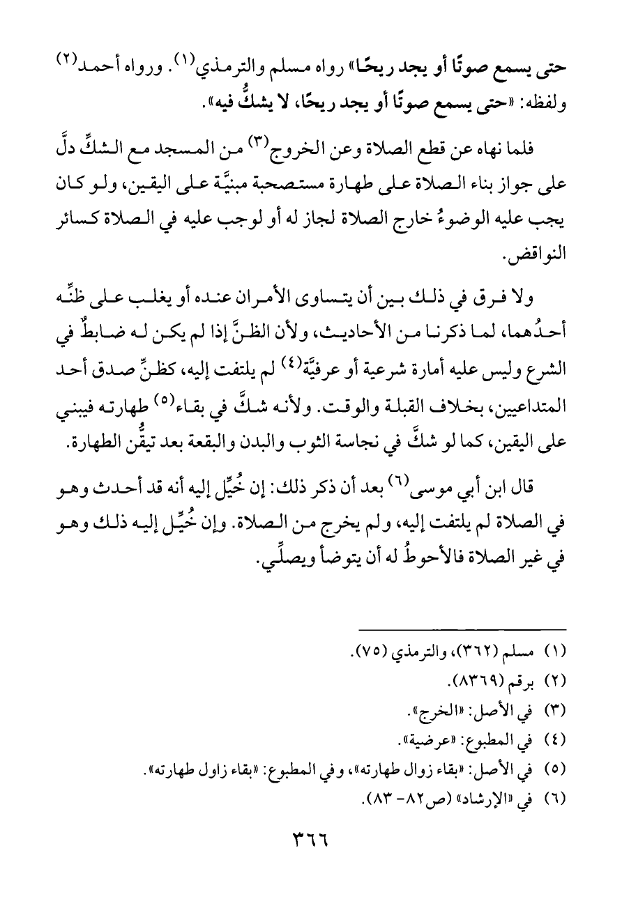 حتى يسمع صوتًا أو يجد ريحًا» رواه مسلم والترمذي (¬١). ورواه أحمد (¬٢) ولفظه: «حتى يسمع صوتًا أو يجد ريحًا، لا يشكُّ فيه».
