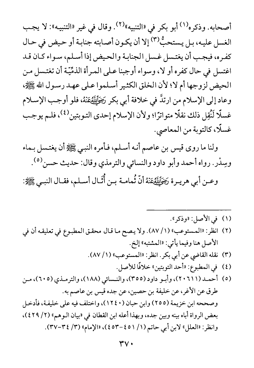 أصحابه. وذكره (¬١) أبو بكر في «التنبيه» (¬٢). وقال في غير «التنبيه»: لا يجب الغسل عليه، بل يستحبُّ (¬٣) إلا أن يكون أصابته جنابة أو حيض في حال كفره، فيجب أن يغتسل غسل الجنابة والحيض إذا أسلم، سواء كان قد اغتسل في حال كفره أو لا، وسواء أوجبنا على المرأة الذمِّيّة أن تغتسل من الحيض لزوجها أم لا؛ لأن الخلق الكثير أسلموا على عهد رسول الله - صلى الله عليه وسلم -، وعاد إلى الإسلام من ارتدَّ في خلافة أبي بكر - رضي الله عنه -، فلو أوجب الإسلام غسلًا لَنُقِل ذلك نقلًا متواترًا؛ ولأن الإسلام إحدى التوبتين (¬٤)، فلم يوجب غسلًا، كالتوبة من المعاصي.