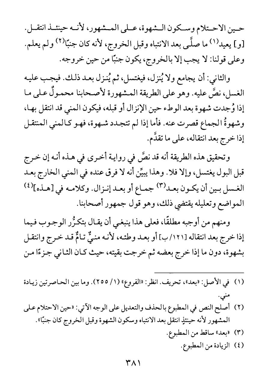 (¬٢) أصلح النص في المطبوع بالحذف والتعديل على الوجه الآتي: «حين الاحتلام على المشهور لأنه حينئذٍ انتقل بعد الانتباه وسكون الشهوة وقبل الخروج كان جنبًا».