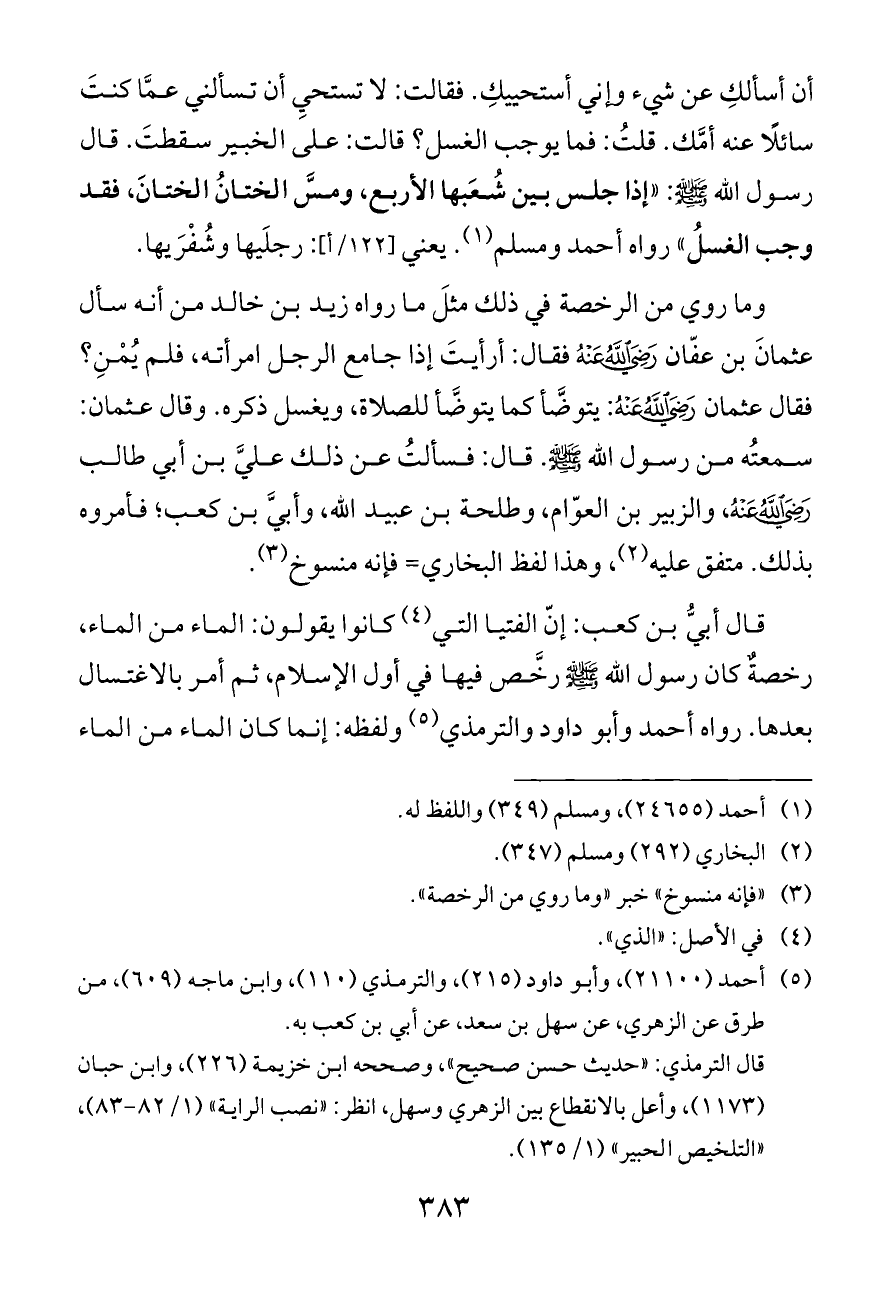 أن أسألكِ عن شيء وإني أستحييكِ. فقالت: لا تستحيِ أن تسألني عمَّا كنتَ سائلًا عنه أمَّك. قلتُ: فما يوجب الغسل؟ قالت: على الخبير سقطتَ. قال رسول الله - صلى الله عليه وسلم -: «إذا جلس بين شُعَبها الأربع، ومسَّ الختانُ الختانَ، فقد وجب الغسلُ» رواه أحمد ومسلم (¬١). يعني [١٢٢/أ]: رجلَيها وشُفْرَيها.