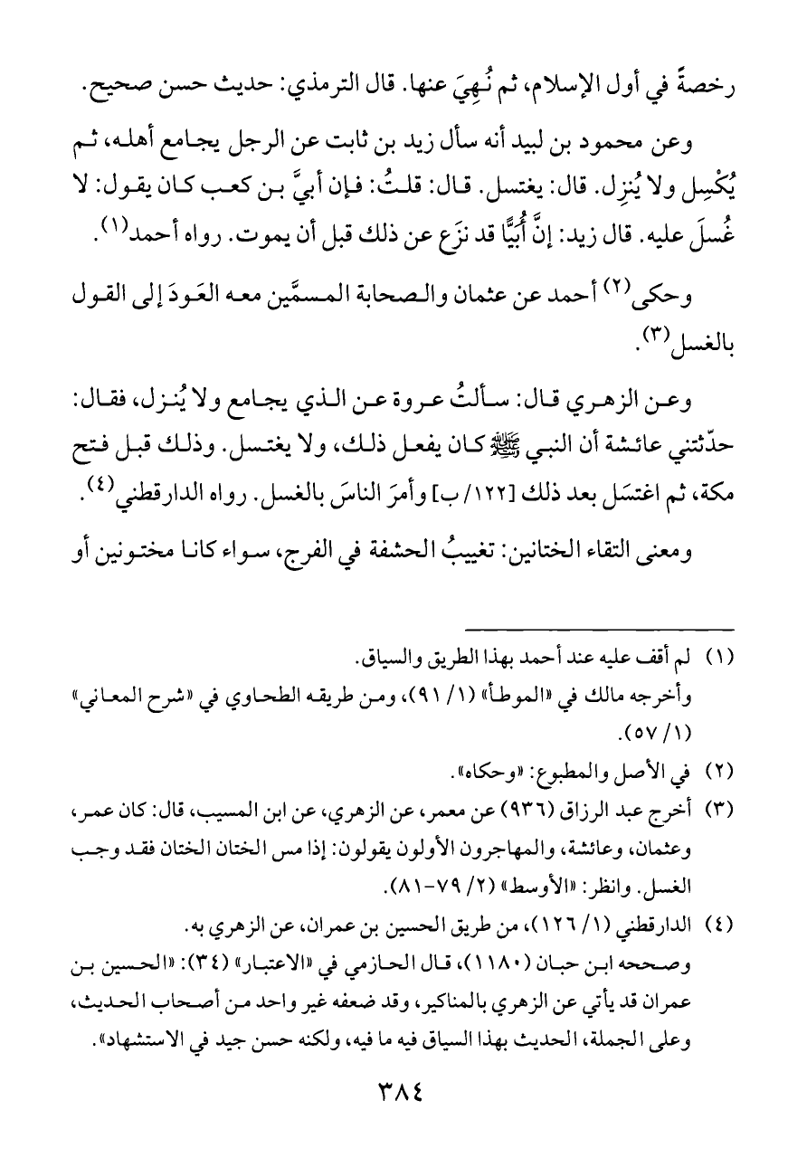وعن الزهري قال: سألتُ عروة عن الذي يجامع ولا يُنزل، فقال: حدّثتني عائشة أن النبي - صلى الله عليه وسلم - كان يفعل ذلك، ولا يغتسل. وذلك قبل فتح مكة، ثم اغتسَل بعد ذلك [١٢٢/ب] وأمرَ الناسَ بالغسل. رواه الدارقطني (¬٤).