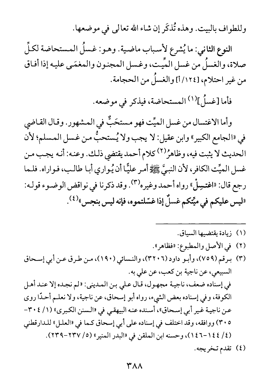 وأما الاغتسال من غسل الميِّت فهو مستحَبٌّ في المشهور. وقال القاضي في «الجامع الكبير» وابن عقيل: لا يجب ولا يُستحبُّ من غسل المسلم؛ لأن الحديث لا يثبت فيه، وظاهرُ (¬٢) كلام أحمد يقتضي ذلك. وعنه: أنه يجب من غسل الميِّت الكافر، لأن النبيَّ - صلى الله عليه وسلم - أمر عليًّا أن يُواري أبا طالب، فواراه. فلما رجع قال: «اغتسِلْ» رواه أحمد وغيره (¬٣). وقد ذكرنا في نواقض الوضوء قوله: «ليس عليكم في ميِّتكم غسلٌ إذا غسّلتموه، فإنه ليس بنجس» (¬٤).