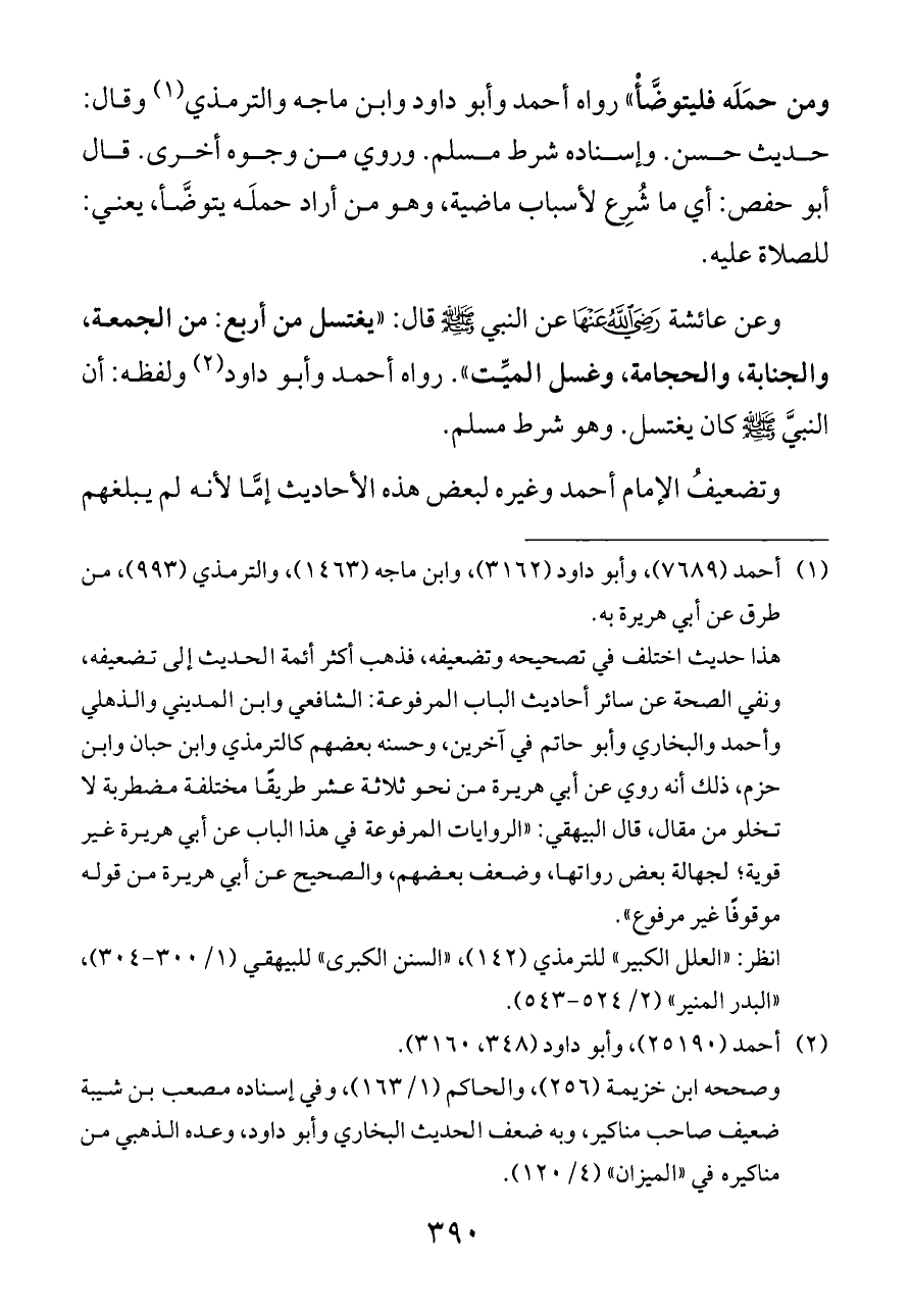 ومن حمَلَه فليتوضَّأْ» رواه أحمد وأبو داود وابن ماجه والترمذي (¬١)
