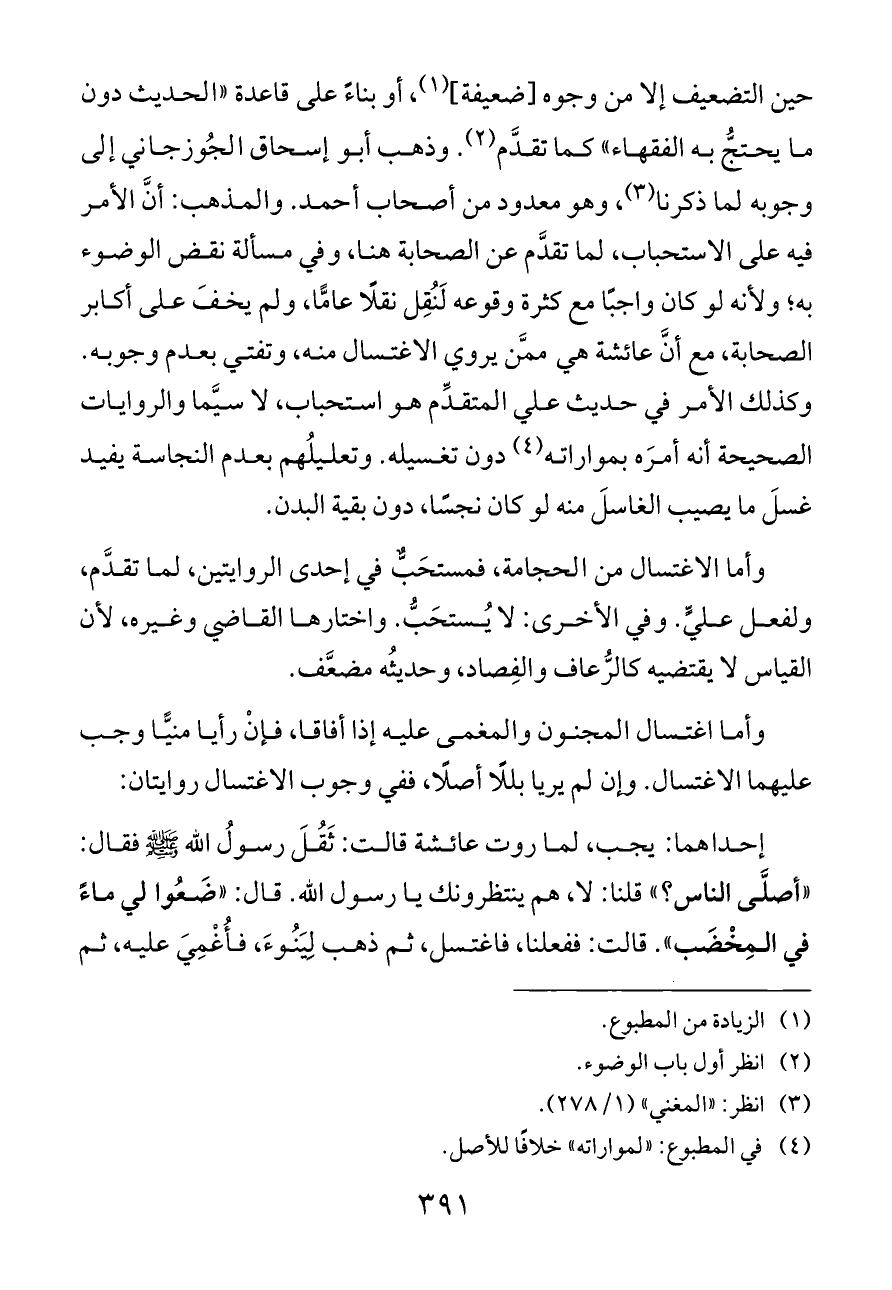 حين التضعيف إلا من وجوه [ضعيفة] (¬١)، أو بناءً على قاعدة «الحديث دون ما يحتجُّ به الفقهاء» كما تقدَّم (¬٢). وذهب أبو إسحاق الجُوزجاني إلى وجوبه لما ذكرنا (¬٣)، وهو معدود من أصحاب أحمد. والمذهب: أنَّ الأمر فيه على الاستحباب، لما تقدَّم عن الصحابة هنا، وفي مسألة نقض الوضوء به؛ ولأنه لو كان واجبًا مع كثرة وقوعه لَنُقِل نقلًا عامًّا، ولم يخفَ على أكابر الصحابة، مع أنَّ عائشة هي ممَّن يروي الاغتسال منه، وتفتي بعدم وجوبه. وكذلك الأمر في حديث علي المتقدِّم هو استحباب، لا سيَّما والروايات الصحيحة أنه أمرَه بمواراته (¬٤) دون تغسيله. وتعليلُهم بعدم النجاسة يفيد غسلَ ما يصيب الغاسلَ منه لو كان نجسًا، دون بقية البدن.